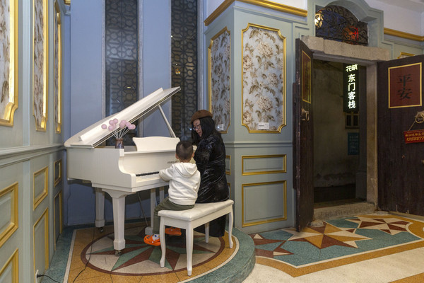 从儒学宫的牌坊进去大概200米,一条直路,穿过小巷子就到了,也可以喊管家用电瓶车接送,十分友好。巷里摩洛哥的“巷里”,就有一幅长长的骆驼壁画,开启疯狂拍照模式。