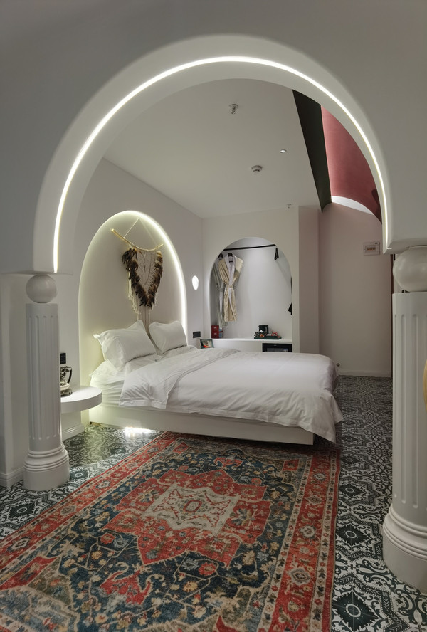 房间我选择了狄娃 | 情侣蜜月大床房,自带浴缸的房间,是旅行中不二的选择;房间五扇圆拱门设计,令房间充满了异域风情,一套茶壶,一把椅子,就能看出主人对细节的追求。