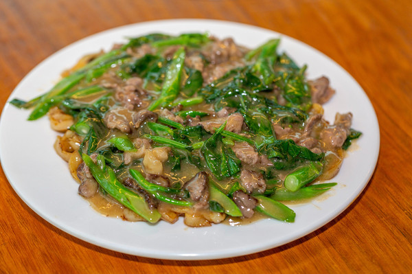 潮州牛肉专在刀工,把牛肉切得均匀透薄,且细分至各个部位:雪花肉、牛舌、牛百叶、吊龙肉、匙柄、吊龙伴、脚趾、五花趾、三花趾、嫩肉、肥牛、胸口朥…8-15秒的涮烫时间,每一口都鲜美无比;配上一口浓浓的甜口沙茶酱,肉汁丰盈,肉香浓郁,令人回味无穷!芥兰正当时,惹味的牛肉+粿条湿炒,肉香、粿条香叠加在一起,这一口,谁不爱?!