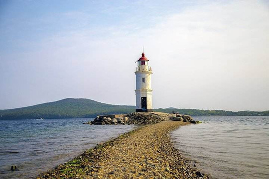 之前我确认过谷歌的平面和立面图,在我们南面岛尖的位置有一个小灯塔,大约有半小时的行程。早上看天气稍阴,正是徒步的好时节。我们一家三口带上雨具就出发了,半路上就下起了小雨,我们在避雨时,品尝了路边小店的早餐,常规的热狗咖啡还是很合味口的,而且经济实惠。再往前走时,就已是迷雾重重了。我们正担心到了海边什么也看不到时,忽然就烟消云散了。我们在坡下回头看时,见那团云雾只飘在山顶,更是有几片就飘在高楼的中间。那层的居民早上开窗时,脚踩云雾眼前晴空万里肯定是仙境飘飘的感觉!及至到了海边,才发现这里的灯塔好小,顶多四五层楼高的样子,象是个微缩的景观。不过这里的海好纯净,应该是东北亚最干净的海了。旁边是当地的地陪带几个韩国客人。老婆懂一点朝鲜语,偶尔还能和他们交流一下。徜徉在海边,空气清爽,海风轻拂。海鸥就在身边飞翔,身边还有当地往来的小猫做伴,这里的动物都不怕人,好和谐的感觉!