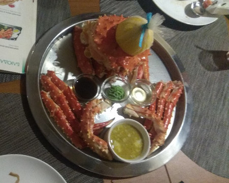 美女服务员会说点英语,基本上可以交流。她先拿上活的帝王蟹,报上重量,询问这个可不可以,我们可以拍照留念。帝王蟹的价格是按重量算的,每只重量都是1斤多不到2斤的样子,一般在400-500元之间,其他配菜都是根据网上点评要的。熟蟹所有的壳都是拍碎的,徒手掰着吃就可以。掰开后是一块块的蒜瓣肉,蟹肉比河蟹多太多了,但味道不象想像中那么鲜美。意大利黑面老婆和孩子最爱吃,饺子扇贝什么的口味一般,冰淇琳有浓浓的奶油味,比国内的好吃!!!