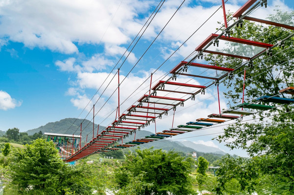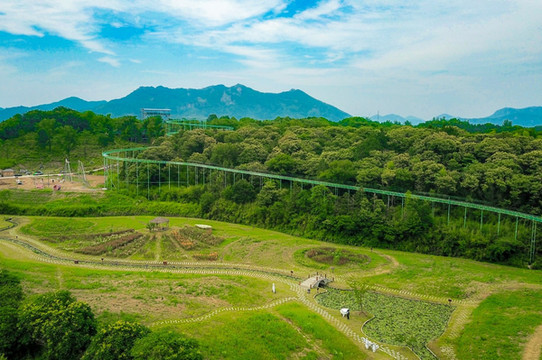 梧桐花谷还是一座欢乐谷,高空玻璃滑水、彩虹滑道、玻璃栈道,天然溪涧皮划艇,坐上总长888米的高空漂流,穿行在林海花海之间、溪流之上,总落差60余米,刺激十足。