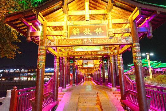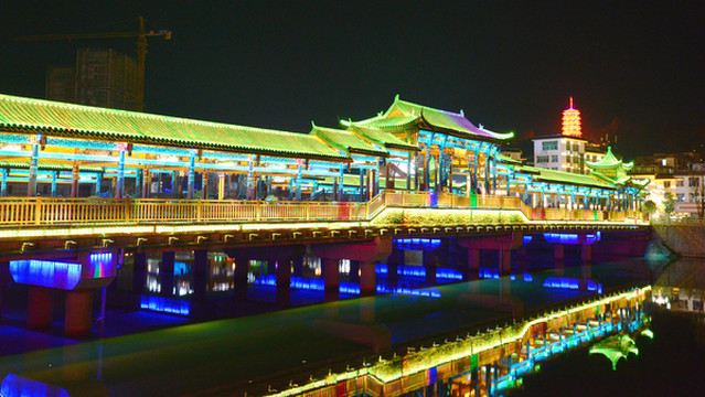 廊桥内的壁画精美异常,在多彩灯光的映衬下,成为了县城江上的亮丽风景,一度让我恍惚,觉得这座解放桥颇像瑞士卢塞恩的廊桥呢。