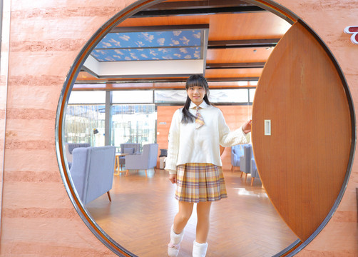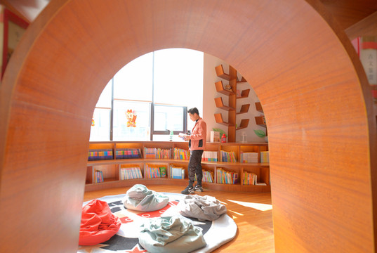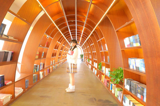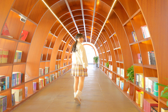 摆书的地方并不是简单的书架,而是做成了时光书廊,它像个隧道,通往光明的未来。