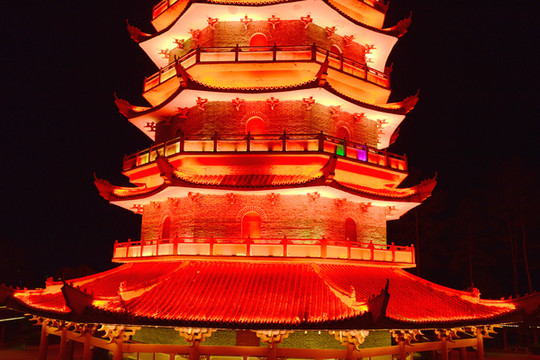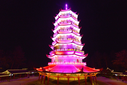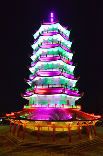 夜色中的宝塔是条“变色龙”,每十秒换一次色,变幻中的塔美轮美奂。
