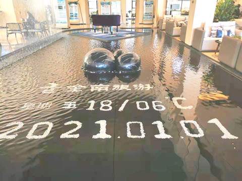一楼大厅有个人造水池,池中用白色石子摆设了当日日期和气温,每天一更新,创意十足,完全不像县城的人能干出的事。