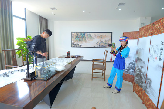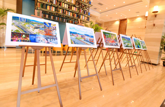 走过水景,两排展板上摆着当地的风光摄影图片展,可以帮助初来全南的宾客快速了解全南的美景。