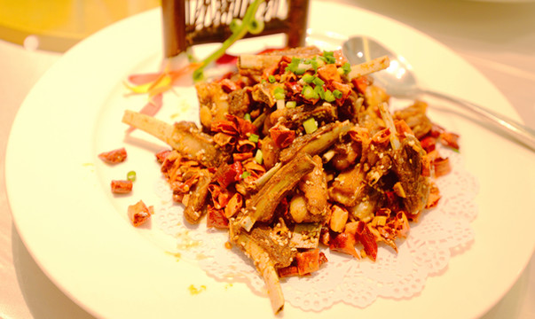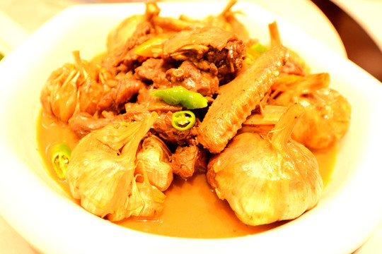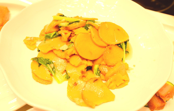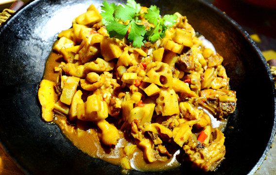 大盘鸡是用莲耦等配料做的,鸡的鲜味被多孔的耦吸收了,而耦被我吃了。