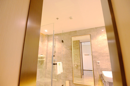 干湿分区的半开放式浴室宽敞明亮,热水出得快,冲澡很爽,浴巾、面巾和地巾干净卫生,柔软舒适。
