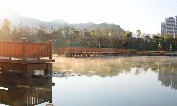 清晨的若湖公园则又是一番模样,湖面上泛起一层白雾,很仙。
