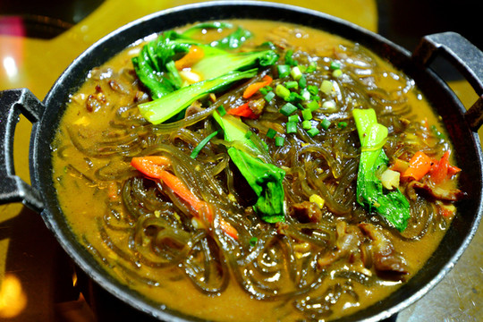 当一大锅的锅仔牛皮粉端上桌时,惊吓到了我,粉的韧、汤的鲜辣交织在口腔中,欲罢不能。