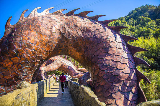 走到距离出口不远的地方,有两只超级巨大的盘旋龙,远远看上去实在太壮观,龙的身体雕刻的活灵活现,威武霸气的模样实在是惟妙惟肖。而且特别神奇的是这两条龙还会吐水!当然了,这个不是真的吐水,而且一个特别网红好玩的项目:“喊泉”