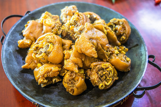 说到猪脚大家最先想到的就是肥腻,而在全南这一家店的猪脚非常出名,猪脚肥而不腻,猪脚皮非常有弹性,吃到嘴里一点也不会觉得油腻,但辣味已深入到肉里了,猪脚比较辣,每一口都很入味, 全南 人喜欢吃这样的口味,一口接着一口停不下来。 据店老板说要想做好好吃的猪脚,卤水很重要,这家的猪脚用的是十年前的卤水煮出来的。他家的干烧卤猪脚的秘诀是每次换掉三分之二,留下三分之一的老汤继续烹煮,如此循环反复,越卖越好。