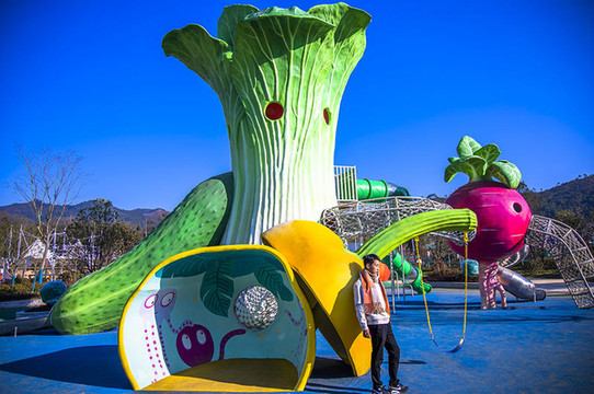 我们来到攀岩小镇,最先就走进园内的:攀之谷攀爬乐园,这里简直就是孩子的天堂,属于孩子们室外活动区域,刚进入门内,映入眼前的是超级可爱的游乐项目,各种的蔬菜造型,实在太可爱啦!五颜六色的,让人眼花缭乱,溜滑梯,儿童攀爬,荡秋千,钻山洞等,好玩的根本停不下来。