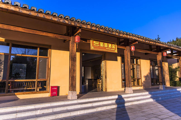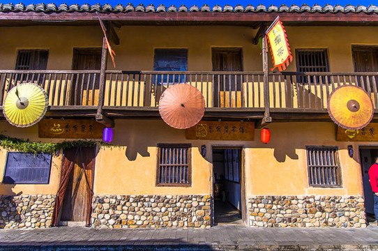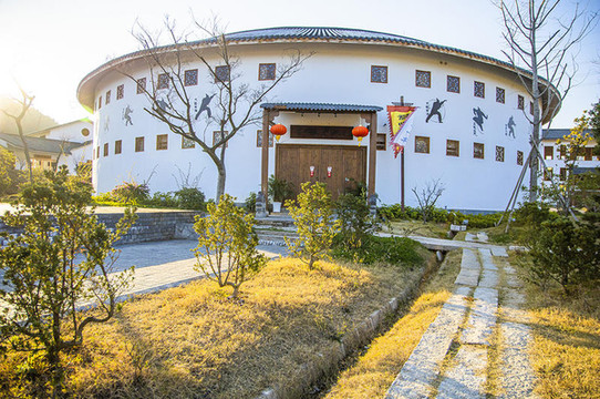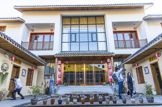 在民宿门口两侧还设有金庸馆、神仙姐姐奶茶、古裳坊、陶艺坊门店,武侠元素一个都不少。另一幢被建成围屋模样的酒店,也是非常有特色。