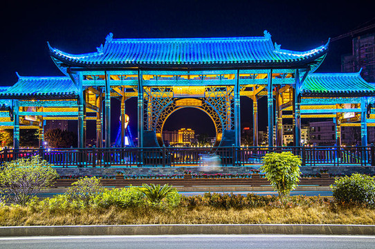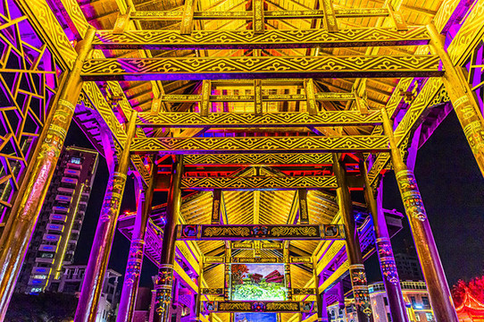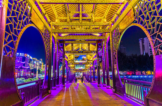 跨年旅游来到全南,夜幕降临,华灯初上。一座古朴精致的,解放桥映入眼帘,飞檐翘角、雕花木窗,整个廊桥宛若长虹卧波,又似蛟龙岀水,繁华而炫丽。