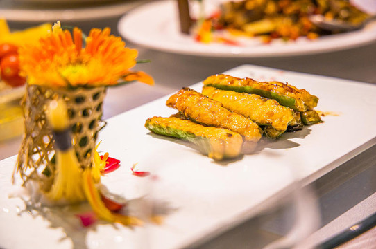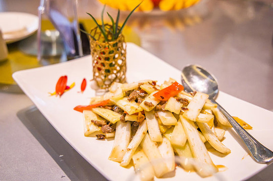 其中还有一道青椒酿鱼茸,很有创意,南县荷梗,芋头丝炒羊肉,都是不一样的好味道,制作精细,调味考究,炸溜、爆、烧、炖,焖、煨、炒,醇而不腻,就连最后的环球水果拼盘,也都是赣州特产特色,不得不说赣州脐橙味道也太好吃啦。色香味俱全,加上造型满分的各种菜肴,简直就是大大的慢足!