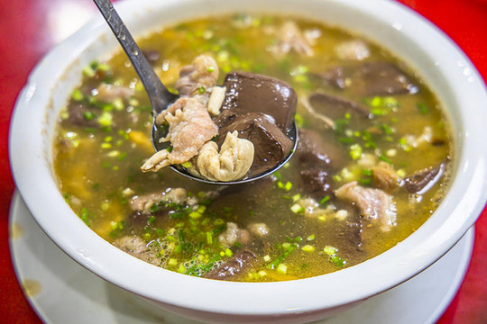 全南人的早餐习惯吃猪红汤,由猪血、猪肉、猪肝、小肠等现煮,刚刚出锅的时候味道最好吃,鲜嫩可口,味道很好,特别是瘦肉很爽滑,好吃。所以这道猪红,可真是这里的一道网红小吃。