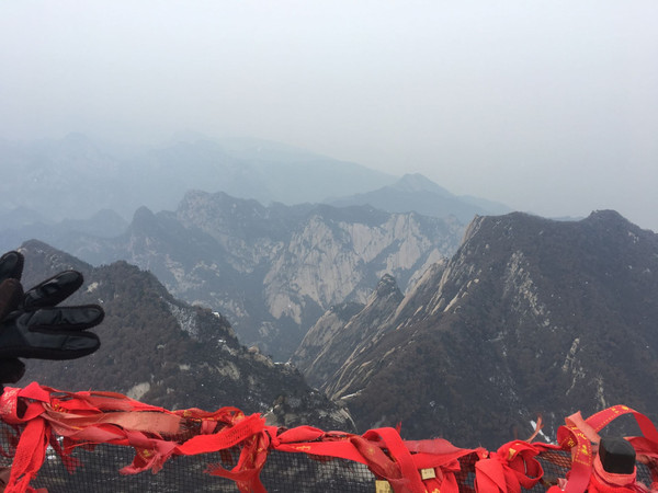 这时,来了2个帅哥,苏州的,他们夜爬到山顶,我也是真心佩服他们!和其中一个聊了会儿天,我也觉得没有那么冷了。天渐渐变亮,东方由红变为黄,我走进一看,原来绳索下面是万丈悬崖,好似无底洞般,我突然对华山产生了一丝的敬畏。