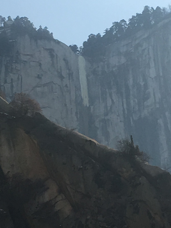 12点三刻,我开始下山,还是那条回头路。途径五云峰,到这里吃了点干粮,往身后能从另一角度观赏西峰,特别壮观,那峰顶恨不得要遮天盖地;对面的冰瀑布好似垂下的玉带,非常漂亮。