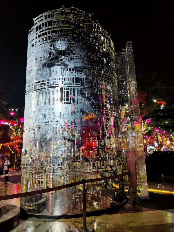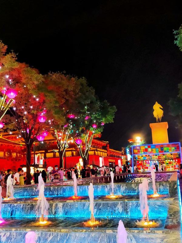 如果说白天的西安是一位80岁的老者,写满了沧桑和厚重,那么夜晚的西安就是一位18岁的妙龄少女,浑身透露着活力和诱惑。打卡完永兴坊,我们赶着去大唐不夜城看21:30的喷泉秀。虽说仍处于非常时期,来西安旅游的游客还是非常多的,大唐不夜城就是一个人声鼎沸摩肩接踵的地方。大龙师傅开车带着我在外围的街道转悠了一圈,我都能感受到西安夜幕下的曼妙多姿。可惜周边人多车多,我们转悠了半个小时才找到车位,到景区时喷泉已经结束,正巧赶上了大唐不倒翁的表演。
