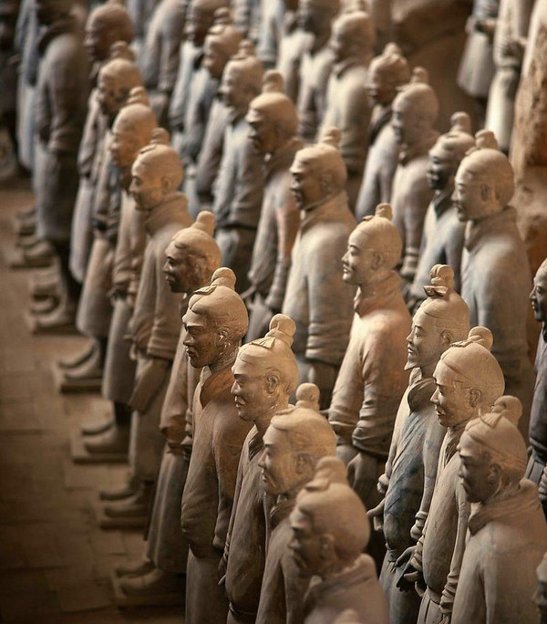 秦始皇兵马俑陪葬坑坐西向东,分别有一、二、三号坑。其中最大最早发现的是一号俑坑,呈长方形,坑里有8000多个兵马俑。兵马俑从身份上区分,主要有士兵与军吏两大类,俑坑中最多的是武士俑,每个陶俑的装束、神态都不一样。人物的发式就有许多种,手势也各不相同,面部的表情更是各有差异、生动传神,古人的塑造工艺真是让人叹为观止!
