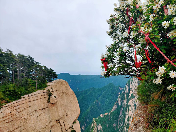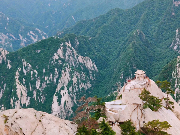 2、南峰。海拔2154.9米,是华山最高主峰,也是五岳最高峰,古人尊称它是"华山元首"。登上南峰,只见群山莽莽连绵不绝,千丈绝壁沟壑耸立,站在山巅,会当凌绝顶、手可摘星辰。