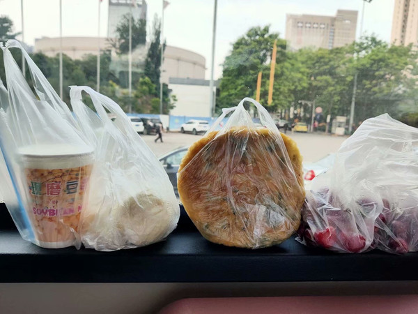 一个人的早餐似乎有点多?额,其实是今天去延安往返700多公里,坐车时间比较久,所以才多买一点路上充饥。