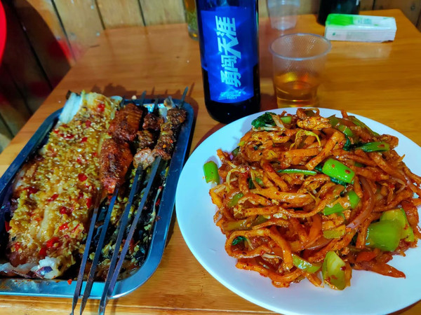 时间尚早,回到宾馆简单洗漱后打车在南大街转悠着,的士师傅很热忱,一路和我聊着西安的那些事儿。回来找个地儿吃东西,一个人也不好怎么点,烤串儿从20串开烤还到5串,最后这炒馍还是浪费了大半份,老板是甘肃人,一上来就问我喝什么酒,可能他觉得独行的人都写满故事吧,有故事当然得有酒,勇闯天涯适合我!