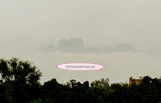 这是在西岳庙最后面,也是最高的藏经楼拍的,下面一张远眺华山的照片是远看华山的最好位置,那华山真像“山”字,可惜那天雾气大看不清。古人选址造西岳庙是很有讲究的,泰山的太庙也是如此。