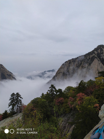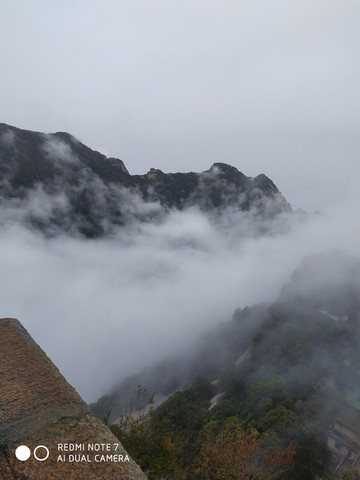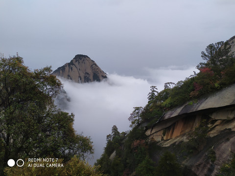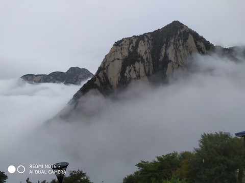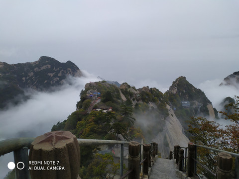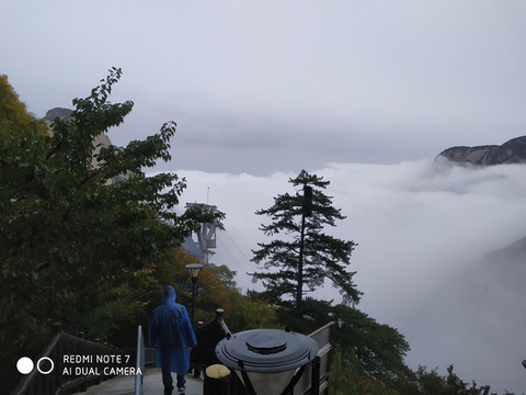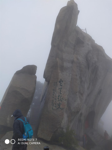 华山是著名景点,尽管下着雨全国各地来的游客还是不少,我们决定乘缆车到北峰游玩就算了,基本上不用排队就上了缆车,在云雾中穿行就到了北峰缆车站,出站雨不下了,云雾拉开后我们看到了华山的倩影,这是许多摄影家多想捕捉的画面呀。我们在画中行走,尽管又下起了小雨我们也不打伞,冲峰衣也能档得住。