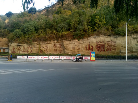 宝塔山下有一处摩崖石刻,有范仲淹,毛泽东,蒋中正的题词,说明了延安的历史。