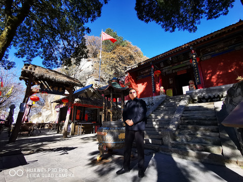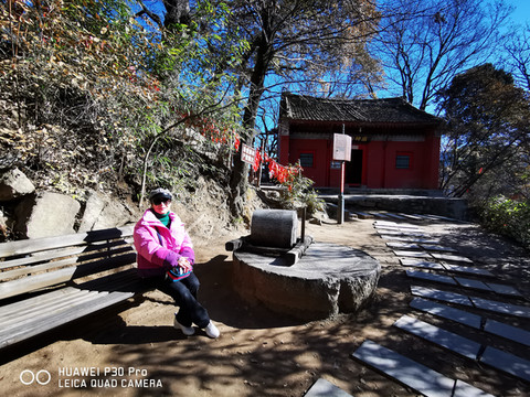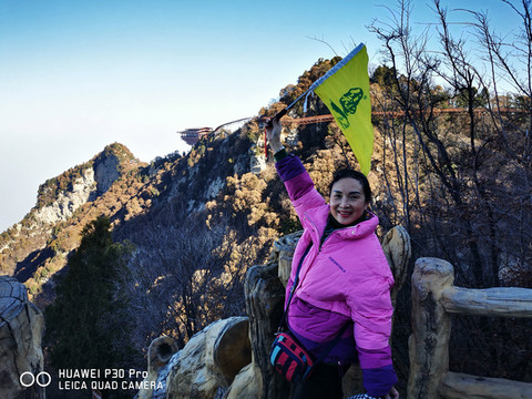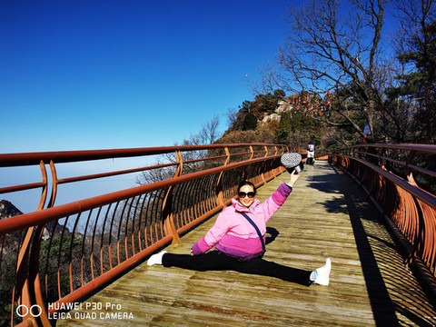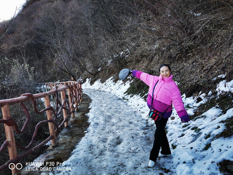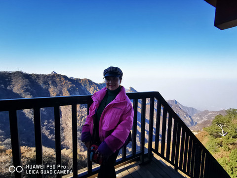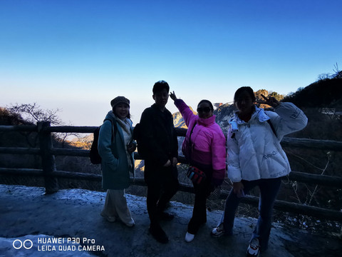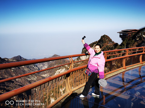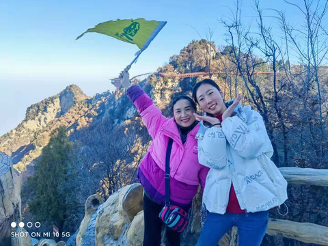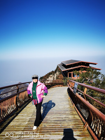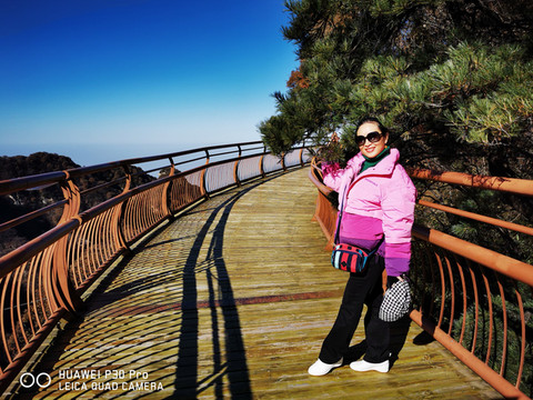 7点多启程约9点多到达少华山脚下,车行两个小时,一路上仍是欢声笑语。大巴上巧遇一个10人的团队,还有另一个散客,一共13名游客。天气较西安市区冷了一些,微风习习,腿脚有些许感觉。步行约5分钟到达景区摆渡车站点,每人30元往返;车行约10分钟,到达上山索道站口,每人100元往返。乘索道上山,窗外两边看去已是萧瑟的秋色了。连绵的群山,谷幽水秀、石奇林茂、郁郁葱葱,令人赏心悦目。导游美女小郑说:若早来几日这里还是一片枫红雪白的壮丽景色。据说也是国内最长、最险的客运索道,从空中俯瞰少华山又是另一番景致。上山后首先要去的是著名的“玻璃栈道”,一路上白雪皑皑、松青云白草仍绿,人少稀疏天自蓝。近看曲径通幽处,远眺广漠大无边。心旷神怡,摆脱了几个月因疫情困惑的心态,放松放飞在这空旷的山野高天中……