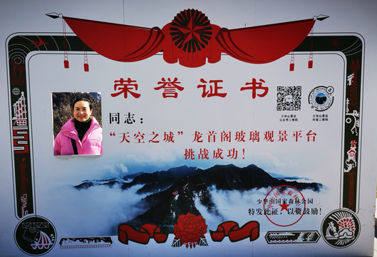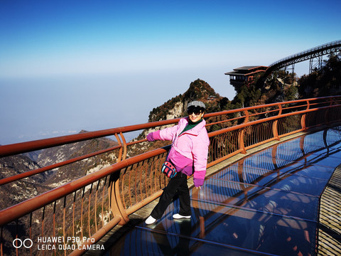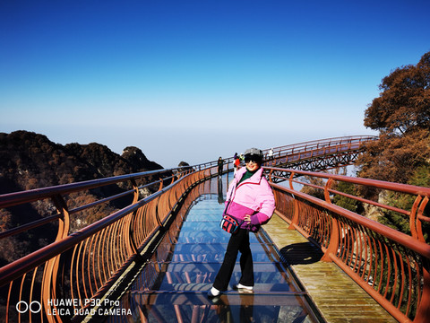 山径小路、木板栈道、拾阶而上,看见龙头悬空伸出山外,山似龙脊,树也龙尾,悠悠腾云驾雾而起。我等小心翼翼探步而行,恐惊龙威更担心自己摔个大跟头。约步行半个多小时,来到山顶的玻璃栈道;这是一条钢架混凝土主体,桥面中间镂空以玻璃盖做桥面的凌空数百米的山外观景桥梁。山顶海拔1600多米,让走在上面人脚软头眩,扶栏望去,峭壁四周景色无限,脚下是万丈深渊、绿树成荫,惊险刺激。