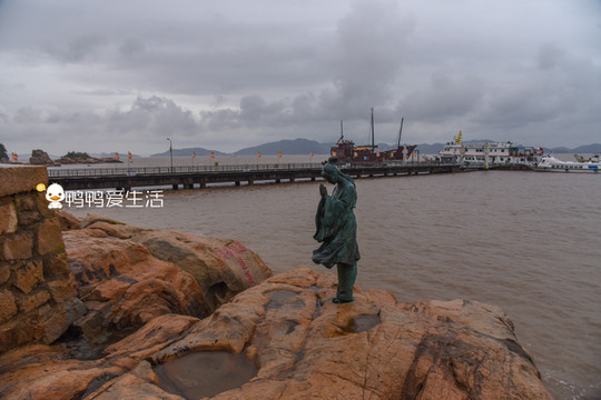 在牌坊右侧礁石上还立有一个人像,双手合十朝普陀山礼佛,这便是传说中的“短姑圣迹”中的一景。