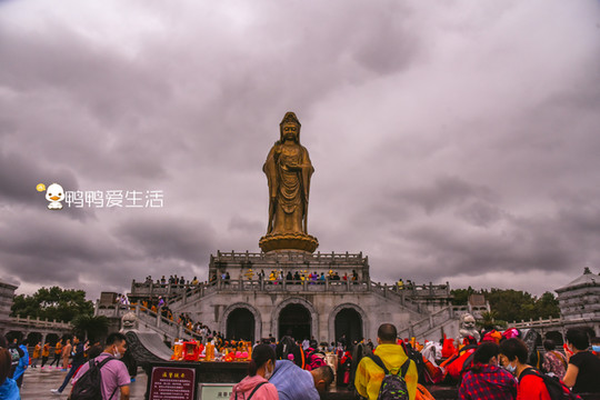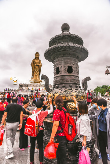 乌云密布的天气之下,观音圣像更添一份威严之感。香客游客众多,还有不少进香团前来朝拜,在这里能感受到信仰之力。