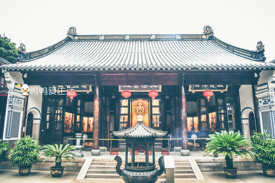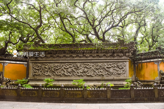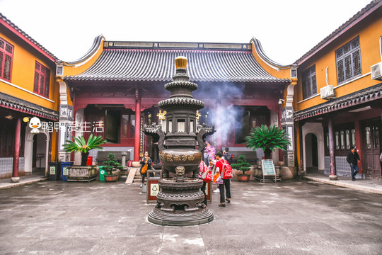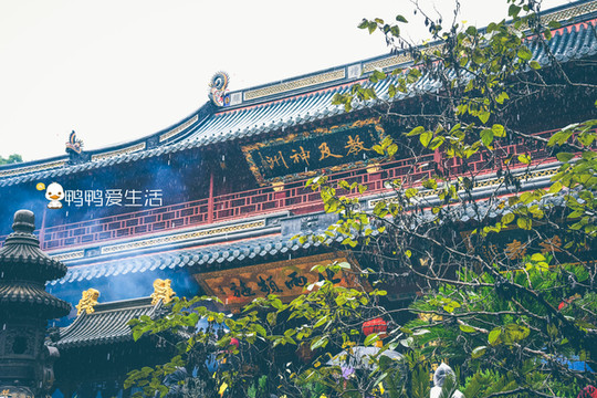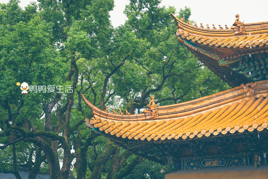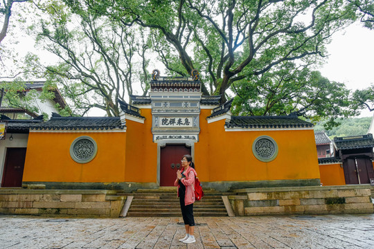 不同于闽南寺院多采用红砖墙,在普陀山的建筑多为明黄色砖墙,这也是皇帝御用的颜色。寺内古树参天,佛音缭绕,禅意悠悠。