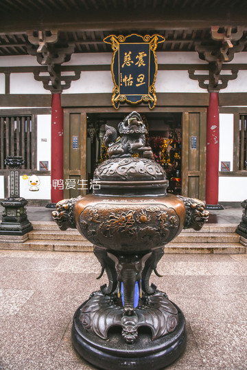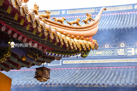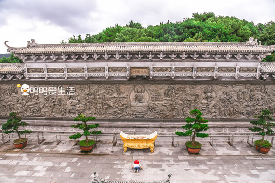 观音殿又称九龙殿,九龙雕刻十分精致生动,九龙殿内的九龙藻井及部分琉璃瓦从南京明故宫拆迁而来,被誉为普陀山三宝之一。最为珍贵的九龙藻井被安置在九龙殿内顶部中间,藻井按古朴典雅的九龙戏珠图案雕刻而成,一条龙盘顶,八条龙环八根垂柱昂首飞舞而下。 八根金柱的柱基是精致的雕龙砖,正中悬吊一盏琉璃灯,宛若一颗明珠,组成九龙戏珠的立体图案,造型优美,刀法粗犷,令人叹为观止。去的时候殿内刚好有法会,只能在殿外抬头一看,真真惊艳,不愧为镇寺之宝。