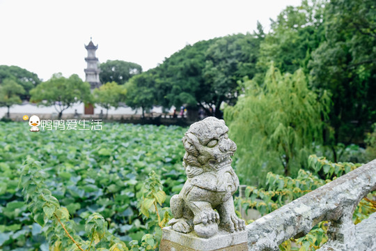 从民宿步行到普济寺,大概10分钟路程,走到普济寺,首先看到的是寺前的莲池,名叫海印池,亦名放生池,它建于明代。这个时候莲叶茂盛,虽已过荷花花期,但还是能看到几朵荷花仍含苞待放,在阴霾的天气中点亮了一抹亮色。