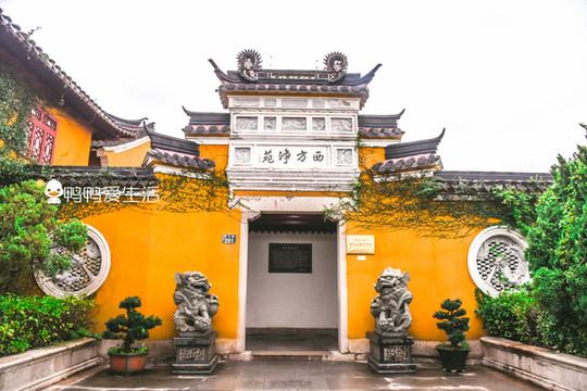 在不肯去观音院边上还有一座西方净苑,现有建筑天王殿及大雄宝殿等为妙善法师近年所建,寺内有观音跳石一块。西厢就是纪念日本僧人慧锷的“慧锷大师纪念堂”,这里供奉着慧锷大师的塑像以及日本33处观音灵场主尊的观音铜像。