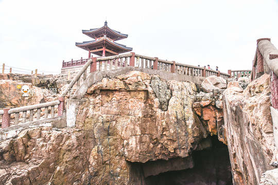 潮音洞半浸海中,纵深30米左右,崖至洞底深约10余米,洞内怪石交错。洞口朝大海,呈张口状,日夜为海浪所击拍,潮水奔腾入洞口,势如飞龙,声若雷鸣,故名潮音洞。“潮音洞”三字乃是清康熙三十八年(1699)御书刻于洞壁之上。