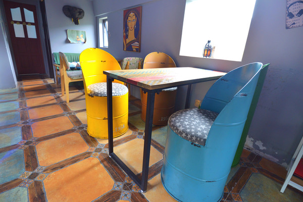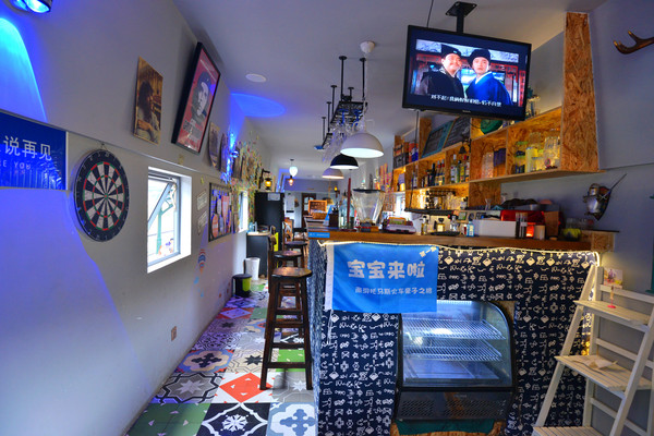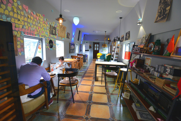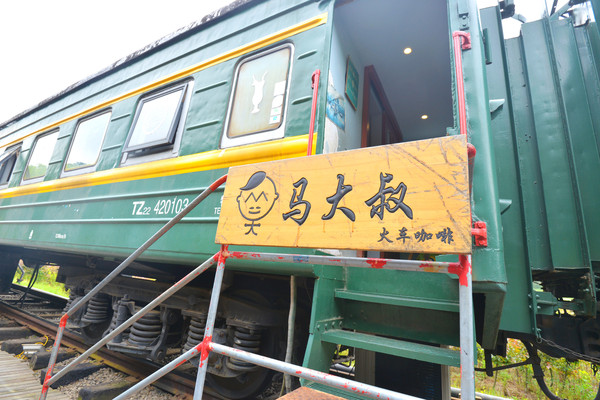 有2节车厢改装为了咖啡馆,原装的座位拆掉了,换成了文艺腔调的桌、椅。