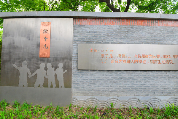 传统与创意在这里激荡,墙上印刻着老杭州方言,写着“撒子儿”、“木佬佬”等杭州话,一旁注有解释,竭尽全力保护和宣传老杭州独特的文化底蕴。