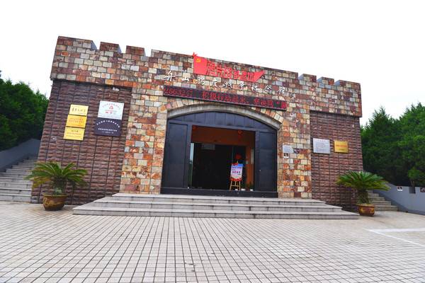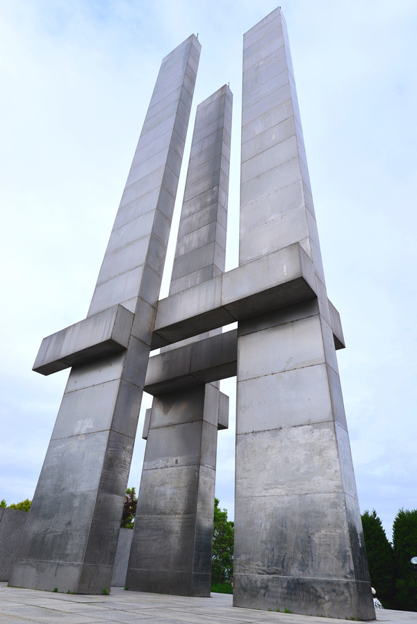 遗址公园大门口竖立的几根伤痕累累、残缺不全的红色花岗岩石柱,象征着中华民族百折不挠、威武不屈的气节。