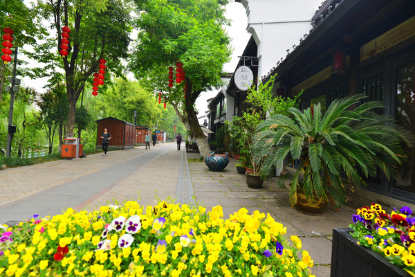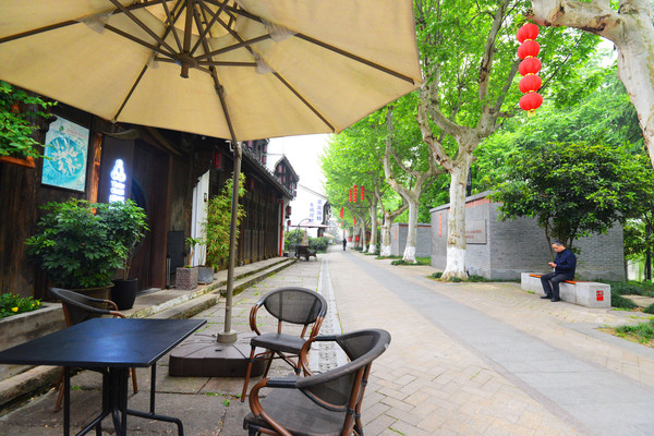 街区不长,呈南北走向,路面是石板铺就,一块石板一个故事,河边是高大整齐的杉树及低矮的柳树,沿岸设有一些坐凳和亲水平台,河边独坐着一位老人,充满着真实的烟火味,岸上是古街区,白墙、黑瓦、木门、木窗,古意盎然,是杭州精致慢生活的代表地之一。