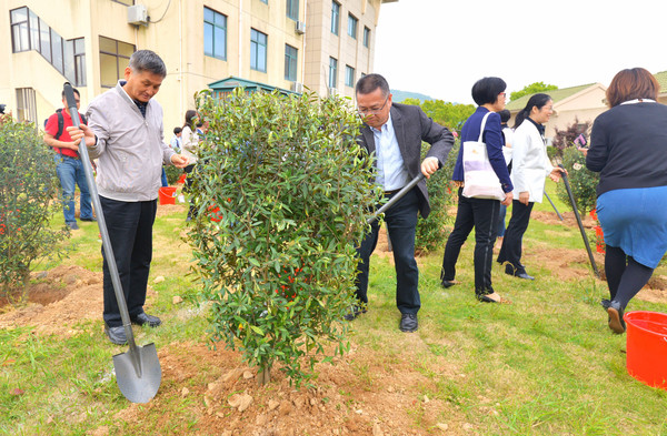植树地点在小沙街道办事处的大院内,中国作协副主席叶辛与散文奖获得者一起,每人种下一棵橄榄树,我也锹了几铲土。