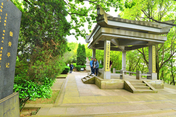 路上有座傲骨亭,建在晓峰岭与竹山之间的山脊,此亭是为褒扬定海三总兵等先烈在定海保卫战中以身殉国的民族气节而特地建的。