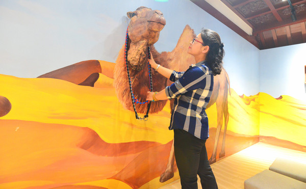 登上二楼,这里设置了“雨季不再来”、“撒哈拉的故事”两个主题区,参观者们大多会在这里牵着假骆驼的缰绳,想象自己和三毛一起在沙漠里骑行。