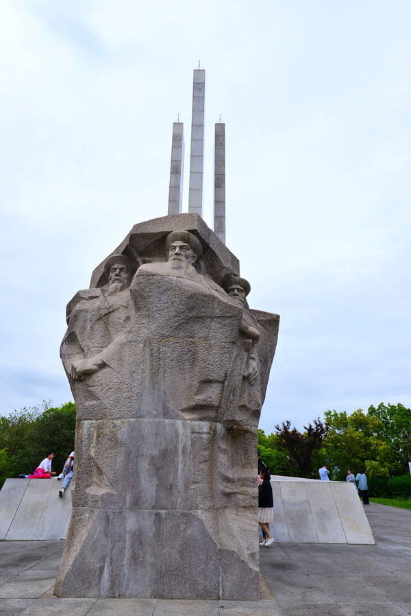 碑前是三总兵像,用红花岗岩雕塑,高6米多,倚剑临风,神情坚毅,目视定海城,象征着誓死保卫国门的浩然正气。