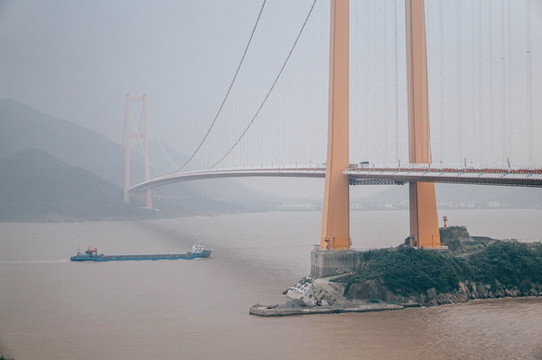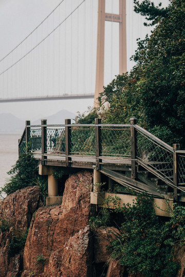 在山上,可以近距离的看到大桥雄姿英发,据说在夕阳之下,显得尤为迷人妩媚,可惜迎接我的是层层雾气,站在这个角度,突然让我想起了 金门 大桥,同样的都是气势磅礴。